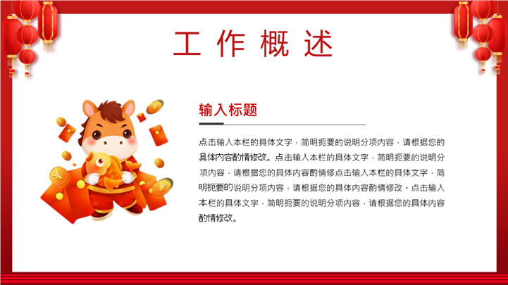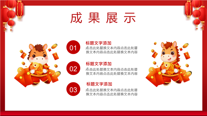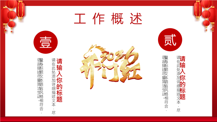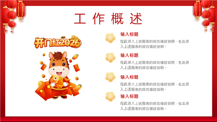 PPT简介: 2026马年开门红红色喜庆工作计划PPT模板,这款2026马年开门红主题PPT模板,专为企业开工动员及销售誓师大会设计。封面采用朱红大门开启与金马奔腾视觉,寓意马到成功、财源广进。模板内含新年业绩目标、战略拆解路径、团队激励口号及军令状签署版式,助您的团队在新的一年业绩长虹。主体文字及图片可替换修改,文字修改均可直接点击文本框进行编辑,图片更改可选中图片后单击鼠标右键插入更换图片,也可根据自身需求增加和删除。本作品提供PPTX格式文件,转载请注明出处!