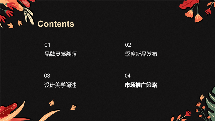 PPT简介: 复古暖色花卉美学品牌策划ppt模板,适用于营销宣传 (具体应用:时尚品牌、艺术策展、美妆新品、生活方式、时尚、美妆、花艺、家居或创意工作室的品牌推广和新品发布)等相关主题设计应用。主体文字及图片可替换修改,文字修改均可直接点击文本框进行编辑,图片更改可选中图片后单击鼠标右键插入更换图片,也可根据自身需求增加和删除。本作品提供PPTX格式文件,转载请注明出处!