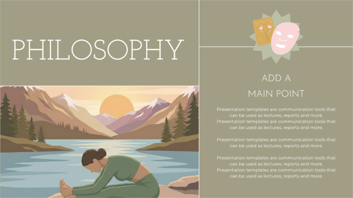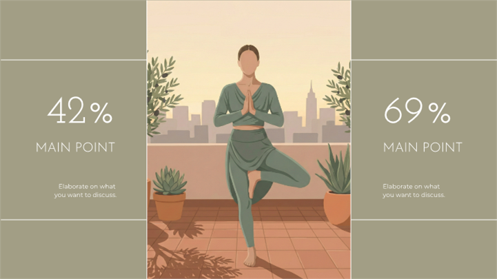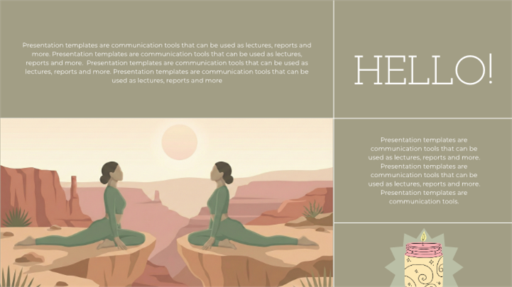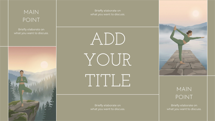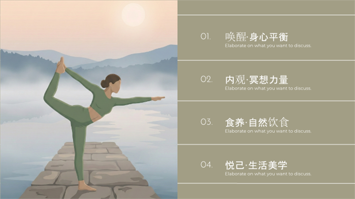 PPT简介: 莫兰迪绿插画风瑜伽身心疗愈ppt模板,适用于医疗健康(老年康复护理、退休健康管理)、体育运动(瑜伽/冥想课程)等相关主题设计应用。主体文字及图片可替换修改,文字修改均可直接点击文本框进行编辑,图片更改可选中图片后单击鼠标右键插入更换图片,也可根据自身需求增加和删除。本作品提供PPTX格式文件,转载请注明出处!