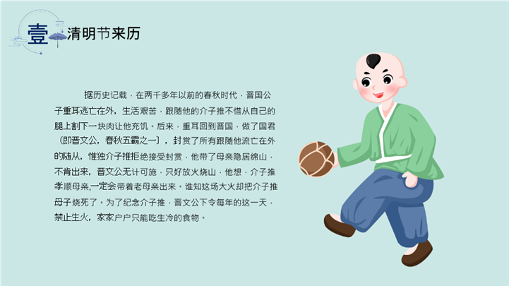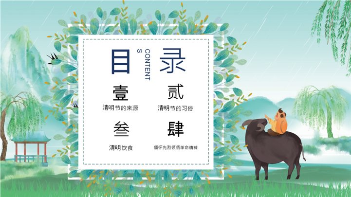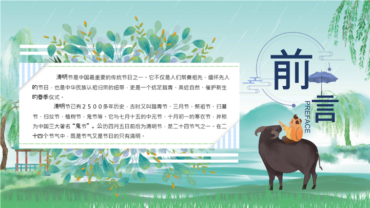 PPT简介: 青绿水墨牧童骑牛清明节文化介绍ppt模板,适用于节日庆典(清明节活动策划、传统节日文化弘扬)、教育培训(古诗词教学课件、语文公开课)、党政党建(慎终追远主题教育)、营销宣传(清明春茶/踏青旅游推广)等相关主题设计应用。主体文字及图片可替换修改,文字修改均可直接点击文本框进行编辑,图片更改可选中图片后单击鼠标右键插入更换图片,也可根据自身需求增加和删除。本作品提供PPTX格式文件,转载请注明出处!