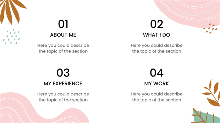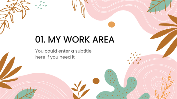 PPT简介: 粉色水彩文艺植物风个人作品集展示ppt模板,适用于自我介绍 (核心匹配:个人作品集、创意简历)、营销宣传 (生活方式、美妆、花艺品牌)、教育培训 (艺术工坊)等相关主题设计应用。主体文字及图片可替换修改,文字修改均可直接点击文本框进行编辑,图片更改可选中图片后单击鼠标右键插入更换图片,也可根据自身需求增加和删除。本作品提供PPTX格式文件,转载请注明出处!