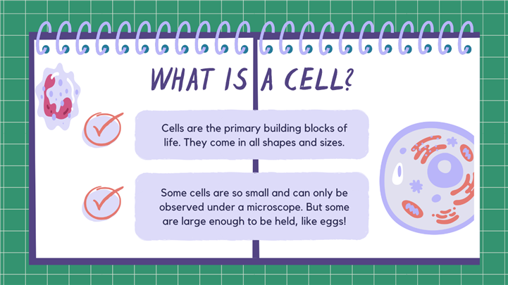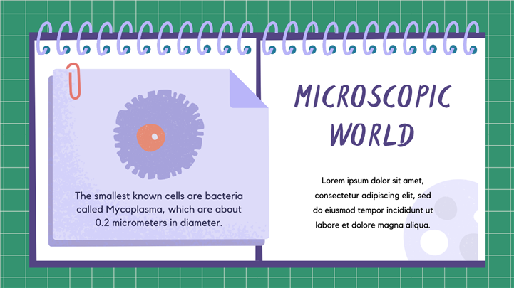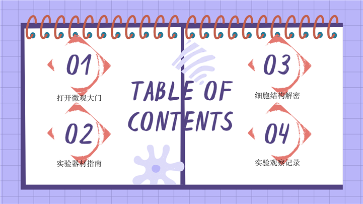 PPT简介: 创意绿色网格初中生物实验课件PPT模板,这款绿色网格笔记本风格生物科学PPT模板,将枯燥的生物课变得生动有趣。界面模拟生物实验记录本,内含手绘显微镜、植物/动物细胞及DNA链条插画。模板包含实验器材介绍、观察记录表、微观结构剖析及课后总结版式,非常适合生物实验课、医学科普及暑期科学营。主体文字及图片可替换修改,文字修改均可直接点击文本框进行编辑,图片更改可选中图片后单击鼠标右键插入更换图片,也可根据自身需求增加和删除。本作品提供PPTX格式文件,转载请注明出处!