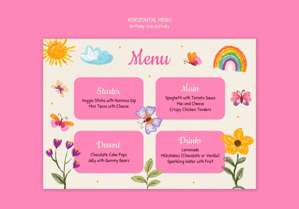 手绘风格儿童生日会菜单模板设计适用于儿童生日会菜单设计