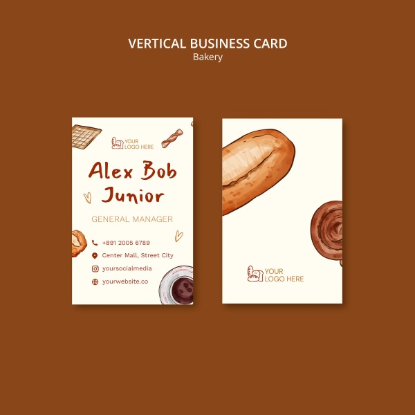 手绘风格面包店竖版商务名片设计适用于面包店商务名片设计