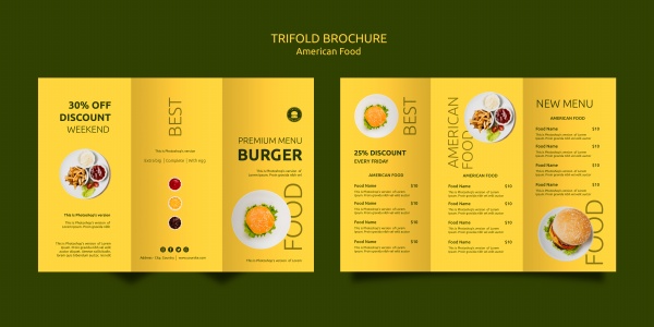 本作品提供黄色美式风格美食宣传三折页PSD模板的图片会员免费下载,格式为PSD,文件大小为31.5M;